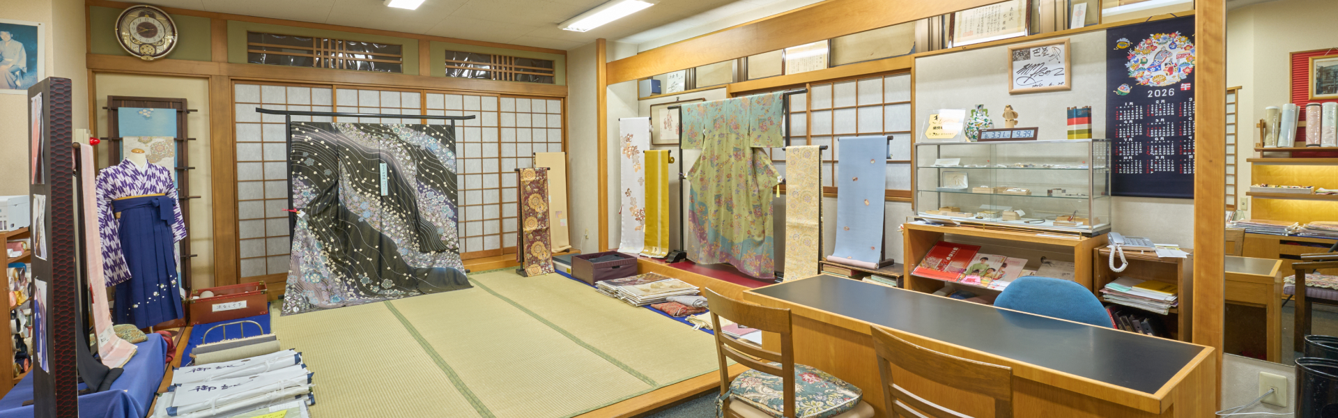 店内には三代目が厳選した品々を取り揃え、着物のことならなんでもお任せいただけるお店として、地域の皆さまにお引き立ていただいております。お近くにお越しの際は、どうぞお気軽にお立ち寄りください。
